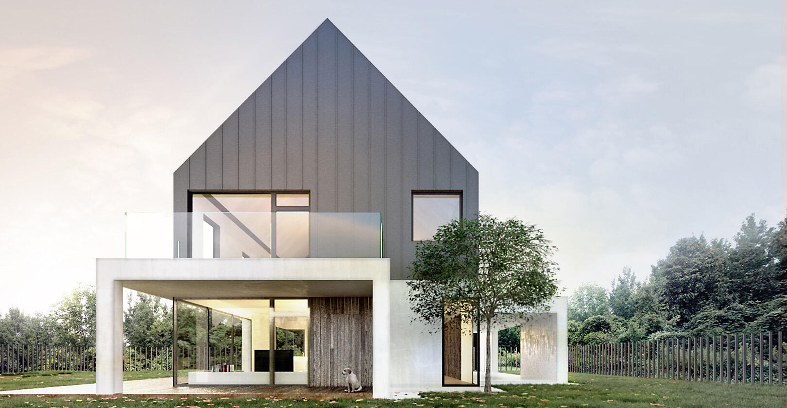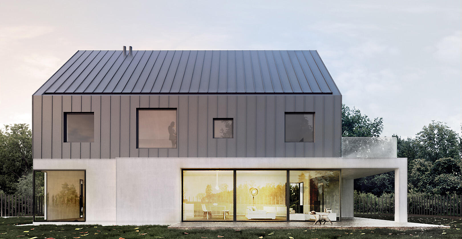 Single-family house on the outskirts of Łódź (Poland) designed with a traditional silhouette reinterpreted through contemporary materials.